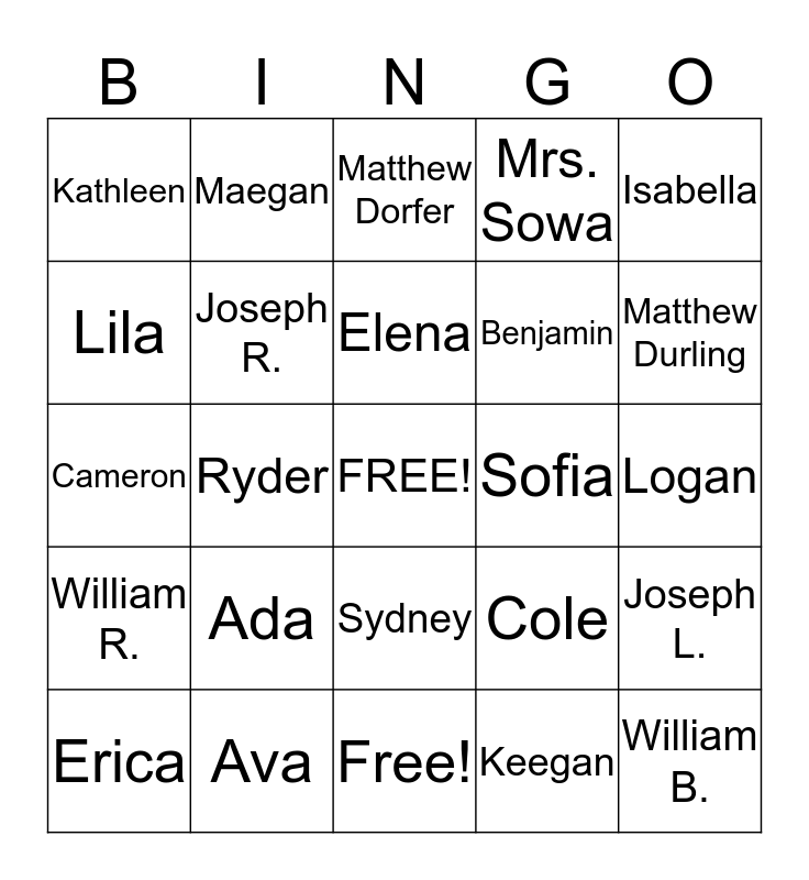 This bingo card has a free space and 24 words: Ada, Ava, Elena, Erica, Isabella, Kathleen, Lila, Maegan, Sofia, Sydney, Benjamin, Cameron, Cole, Joseph L., Joseph R., Keegan, Logan, Matthew Dorfer, Matthew Durling, Ryder, William B., William R., Mrs. Sowa and Free!.