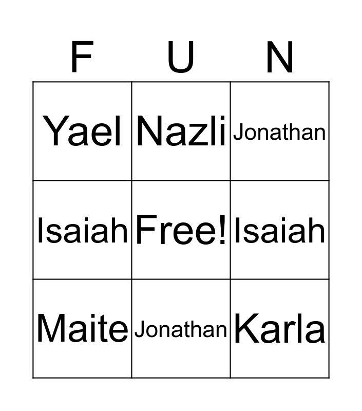 This bingo card has a free space and 8 words: Isaiah, Jonathan, Nazli, Maite, Yael, Karla, Isaiah and Jonathan.