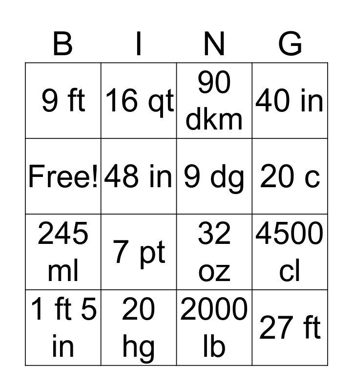 This bingo card has 16 words: 20 hg, 4500 cl, 90 dkm, 9 ft, 245 ml, 16 qt, 32 oz, 2000 lb, Free!, 48 in, 1 ft 5 in, 40 in, 7 pt, 20 c, 9 dg and 27 ft.