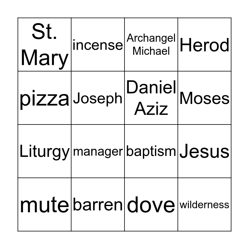 This bingo card has 16 words: barren, Jesus, Archangel Michael, St. Mary, Liturgy, incense, baptism, dove, pizza, Joseph, mute, Herod, manager, Moses, Daniel Aziz and wilderness.