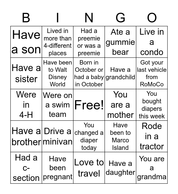 This bingo card has a free space and 24 words: Drive a minivan, Have been pregnant, Born in October or had a baby in October, Had a c-section, Live in a condo, Have a son, Have a sister, Lived in more than 4-different places, You are a mother, You changed a diaper today, Have a grandchild, Were in 4-H, Have been to Marco Island, Rode in a tractor, Have been to Walt Disney World, Have a daughter, You bought diapers this week, Had a preemie or was a preemie, Got your last vehicle from RoMoCo, Were on a swim team, You are a grandma, Have a brother, Ate a gummie bear and Love to travel.