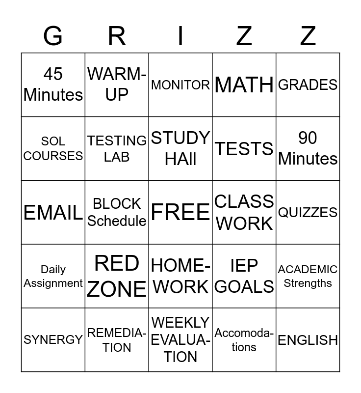 This bingo card has a free space and 24 words: RED ZONE, REMEDIA- TION, STUDY HAll, SYNERGY, GRADES, 45 Minutes, SOL COURSES, WARM-UP, CLASS WORK, HOME- WORK, TESTS, EMAIL, IEP GOALS, ACADEMIC Strengths, TESTING LAB, Accomoda-tions, QUIZZES, MONITOR, 90 Minutes, BLOCK Schedule, ENGLISH, Daily Assignment, MATH and WEEKLY EVALUA- TION.