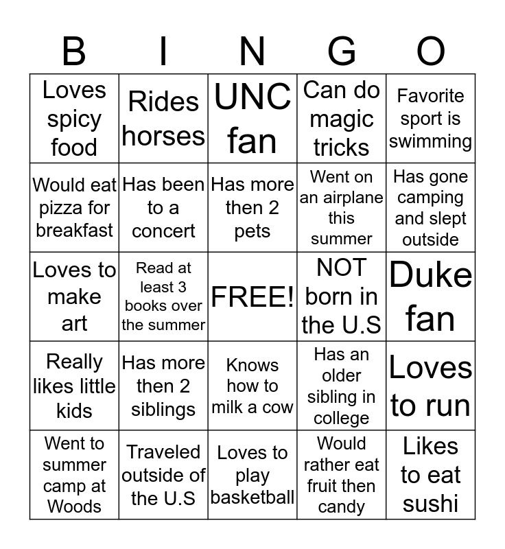 This bingo card has a free space and 24 words: Has more then 2 siblings, Traveled outside of the U.S, Has more then 2 pets, Went to summer camp at Woods, Favorite sport is swimming, Loves spicy food, Would eat pizza for breakfast, Rides horses, NOT born in the U.S, Knows how to milk a cow, Went on an airplane this summer, Loves to make art, Has an older sibling in college, Loves to run, Has been to a concert, Would rather eat fruit then candy, Duke fan, UNC fan, Has gone camping and slept outside, Read at least 3 books over the summer, Likes to eat sushi, Really likes little kids, Can do magic tricks and Loves to play basketball.
