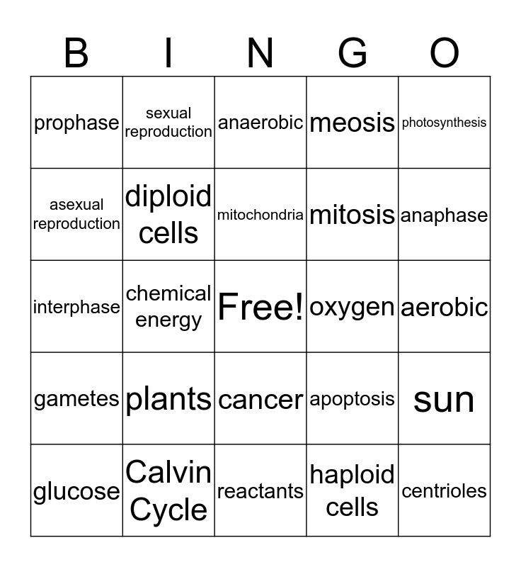 This bingo card has a free space and 24 words: plants, Calvin Cycle, mitochondria, glucose, photosynthesis, prophase, asexual reproduction, sexual reproduction, oxygen, cancer, mitosis, interphase, apoptosis, sun, diploid cells, haploid cells, aerobic, anaerobic, anaphase, chemical energy, centrioles, gametes, meosis and reactants.