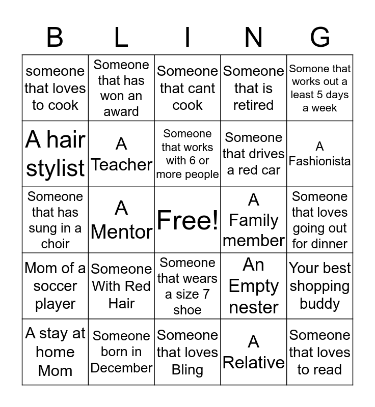 This bingo card has a free space and 24 words: Someone With Red Hair, Someone born in December, Someone that works with 6 or more people, A stay at home Mom, Somone that works out a least 5 days a week, someone that loves to cook, A hair stylist, Someone that has won an award, A Family member, Someone that wears a size 7 shoe, Someone that drives a red car, Someone that has sung in a choir, An Empty nester, Your best shopping buddy, A Teacher, A Relative, Someone that loves going out for dinner, Someone that cant cook, A Fashionista, A Mentor, Someone that loves to read, Mom of a soccer player, Someone that is retired and Someone that loves Bling.