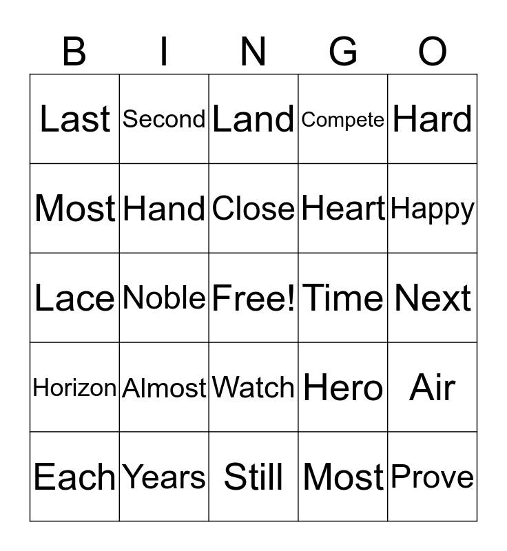 This bingo card has a free space and 24 words: Almost, Years, Close, Each, Hard, Last, Most, Second, Time, Watch, Heart, Lace, Hero, Air, Hand, Most, Next, Land, Happy, Noble, Prove, Horizon, Compete and Still.