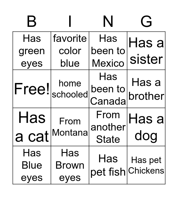 This bingo card has 16 words: Has Brown eyes, Has a dog, Has been to Mexico, Has green eyes, Has a cat, favorite color blue, From another State, Has pet fish, Free!, home schooled, Has Blue eyes, Has a sister, From Montana, Has a brother, Has been to Canada and Has pet Chickens.