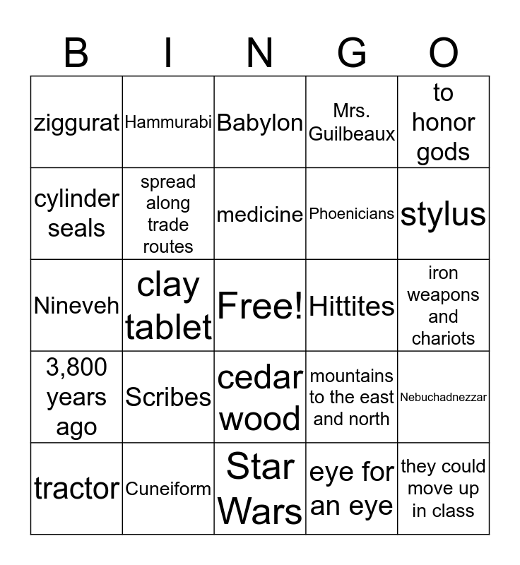This bingo card has a free space and 24 words: Scribes, Cuneiform, medicine, tractor, to honor gods, ziggurat, cylinder seals, Hammurabi, Hittites, cedar wood, Phoenicians, Nineveh, mountains to the east and north, Nebuchadnezzar, spread along trade routes, eye for an eye, iron weapons and chariots, Babylon, stylus, clay tablet, they could move up in class, 3,800 years ago, Mrs. Guilbeaux and Star Wars.