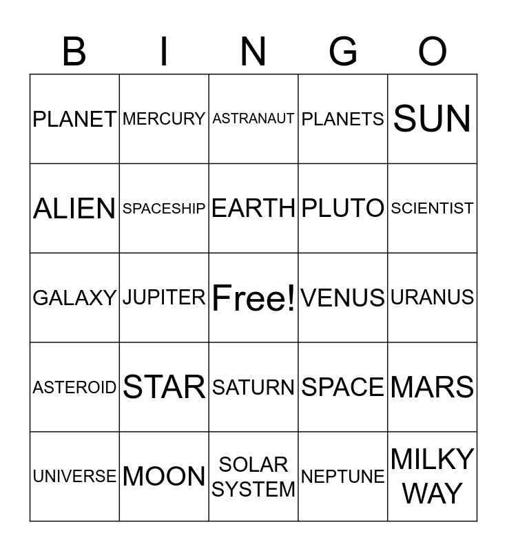 This bingo card has a free space and 24 words: STAR, MOON, EARTH, UNIVERSE, SUN, PLANET, ALIEN, MERCURY, VENUS, SATURN, PLUTO, GALAXY, SPACE, MARS, SPACESHIP, NEPTUNE, URANUS, ASTRANAUT, SCIENTIST, JUPITER, MILKY WAY, ASTEROID, PLANETS and SOLAR SYSTEM.