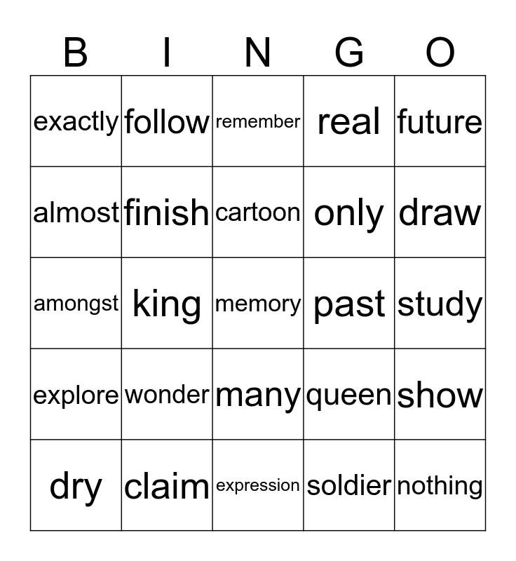 This bingo card has 56 words: build, dry, eventually, exactly, expression, fill, finish, object, only, people, real, through, way, age, century, decade, future, king, long ago, memory, past, present, queen, remember, ruin, cartoon, character, cheerful, draw, front, hidden, naughty, recognise, join, study, almost, amongst, everything, explore, follow, many, nothing, prepare, sign, somewhere, wonder, claim, declare, enough, fly, soldier, war, weapon, get, show and victory.