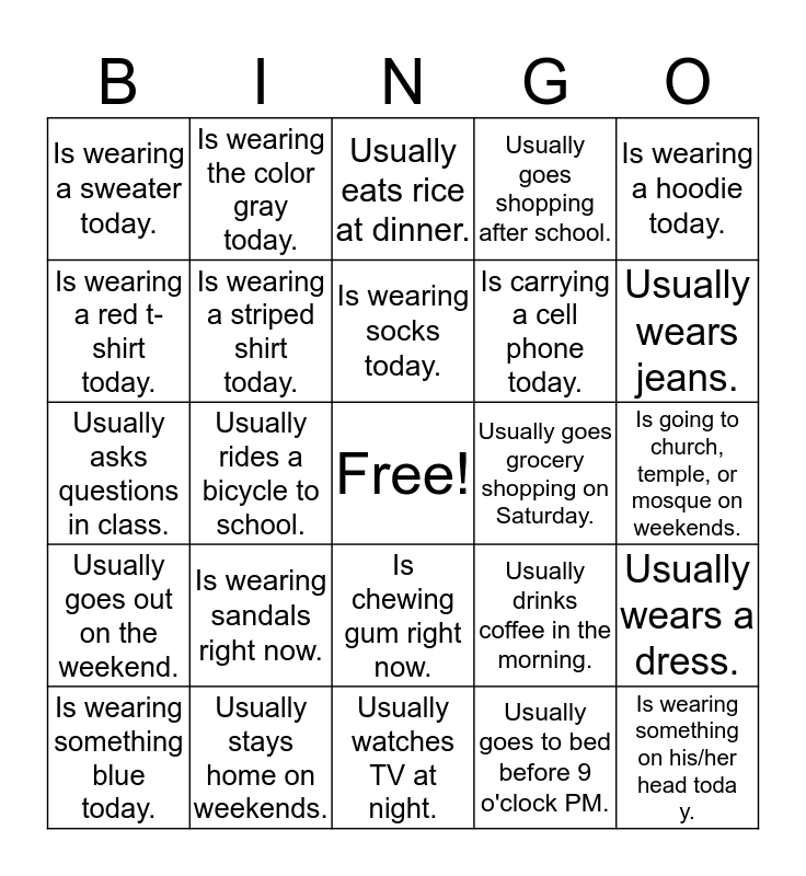 This bingo card has a free space and 24 words: Is wearing sandals right now., Usually stays home on weekends., Is wearing socks today., Is wearing something blue today., Is wearing a hoodie today., Is wearing a sweater today., Is wearing a red t-shirt today., Is wearing the color gray today., Usually goes grocery shopping on Saturday., Is chewing gum right now., Is carrying a cell phone today., Usually asks questions in class., Usually drinks coffee in the morning., Usually wears a dress., Is wearing a striped shirt today., Usually goes to bed before 9 o'clock PM., Is going to church, temple, or mosque on weekends., Usually eats rice at dinner., Usually wears jeans., Usually rides a bicycle to school., Is wearing something on his/her head today., Usually goes out on the weekend., Usually goes shopping after school. and Usually watches TV at night..