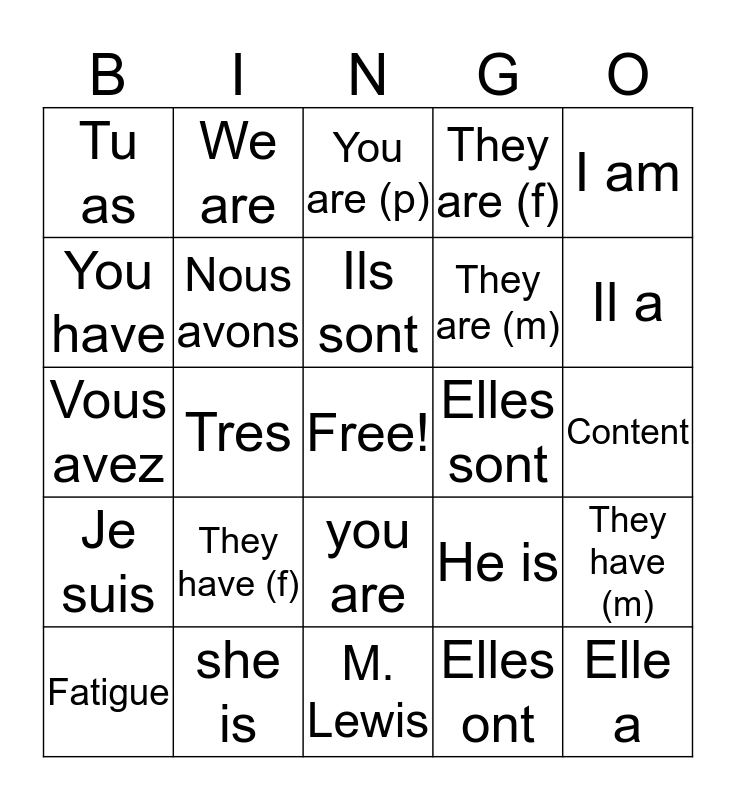 This bingo card has a free space and 26 words: Je suis, Je suis, Nous avons, Vous etes, They are (f), I am, You have, We are, Ils sont, Elles ont, Il a, Vous avez, she is, you are, Elles sont, Elle a, Tu as, They have (f), You are (p), He is, Content, Fatigue, Tres, M. Lewis, They are (m) and They have (m).