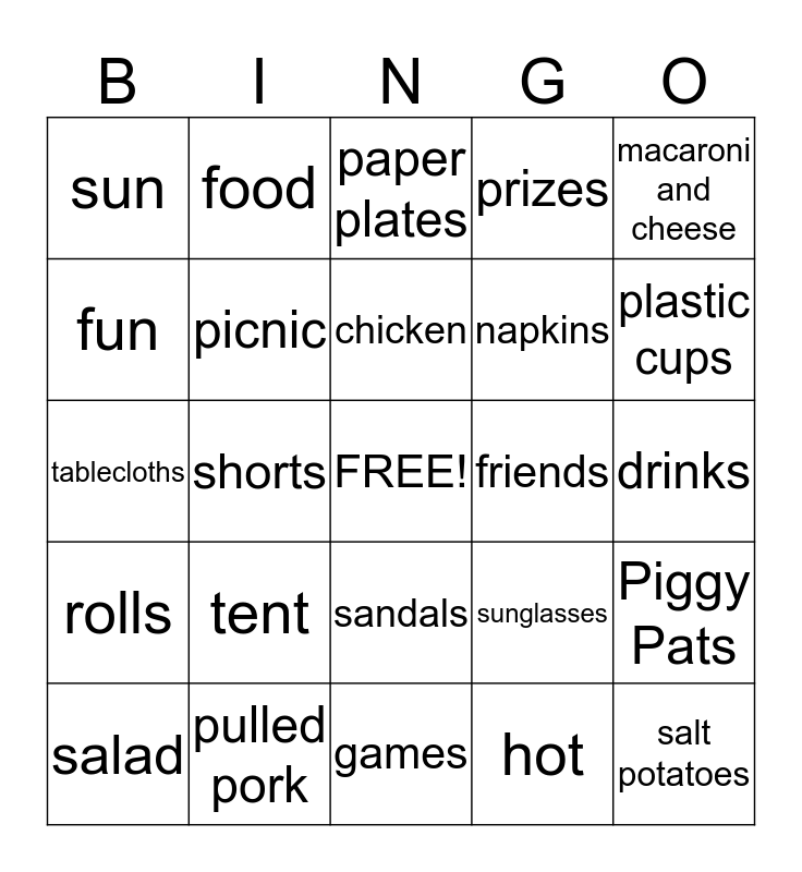 This bingo card has a free space and 24 words: tent, pulled pork, chicken, salad, macaroni and cheese, sun, fun, food, friends, sandals, napkins, tablecloths, sunglasses, Piggy Pats, picnic, hot, drinks, paper plates, plastic cups, shorts, salt potatoes, rolls, prizes and games.