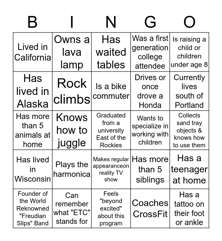 This bingo card has 25 words: Plays the harmonica, Feels "beyond excited" about this program, Is a bike commuter, Founder of the World Reknowned "Freudian Slips" Band, Is raising a child or children under age 8, Lived in California, Has lived in Alaska, Owns a lava lamp, Wants to specialize in working with children, Makes regular appearanceon reality TV show, Drives or once drove a Honda, Has more than 5 animals at home, Has more than 5 siblings, Has a teenager at home, Rock climbs, Has a tattoo on their foot or ankle, Collects sand tray objects & knows how to use them, Has waited tables, Currently lives south of Portland, Knows how to juggle, Graduated from a university East of the Rockies, Can remember what "ETC" stands for, Has lived in Wisconsin, Was a first generation college attendee and Coaches CrossFit.