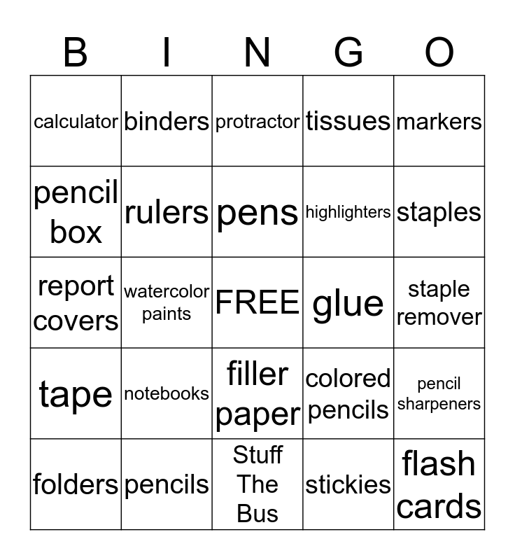This bingo card has a free space and 24 words: notebooks, pencils, pens, folders, markers, calculator, pencil box, binders, glue, filler paper, highlighters, report covers, colored pencils, pencil sharpeners, rulers, stickies, staple remover, protractor, staples, watercolor paints, flash cards, tape, tissues and Stuff The Bus.