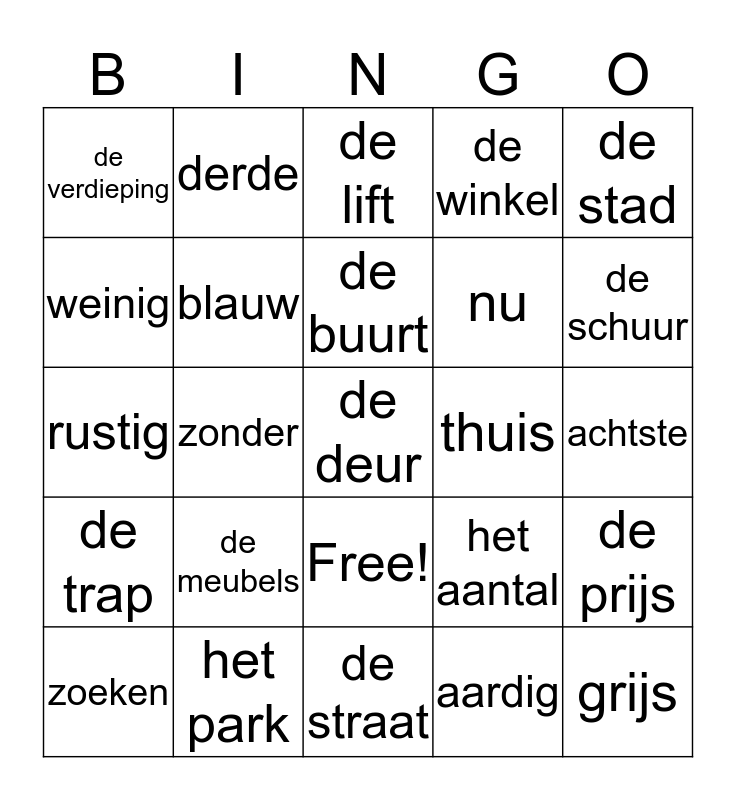 This bingo card has 26 words: Free!, aardig, de buurt, het park, de stad, de verdieping, weinig, derde, achtste, het aantal, nu, rustig, de prijs, zoeken, zonder, te huur, de winkel, de trap, de lift, de deur, de schuur, de straat, thuis, de meubels, blauw and grijs.