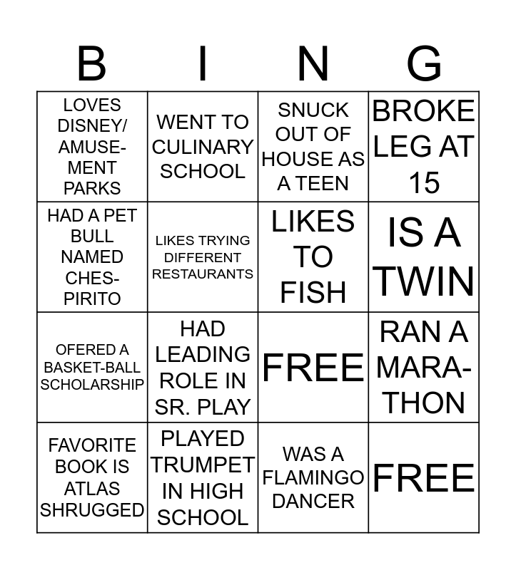 This bingo card has 16 words: PLAYED TRUMPET IN HIGH SCHOOL, RAN A MARA-THON, SNUCK OUT OF HOUSE AS A TEEN, LOVES DISNEY/ AMUSE-MENT PARKS, OFERED A BASKET-BALL SCHOLARSHIP, WENT TO CULINARY SCHOOL, FREE, WAS A FLAMINGO DANCER, HAD A PET BULL NAMED CHES-PIRITO, LIKES TRYING DIFFERENT RESTAURANTS, FAVORITE BOOK IS ATLAS SHRUGGED, BROKE LEG AT 15, HAD LEADING ROLE IN SR. PLAY, IS A TWIN, LIKES TO FISH and FREE.
