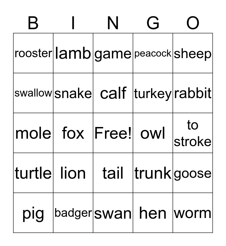 This bingo card has a free space and 33 words: cheetah, rhinoceros, fox, bear, turtle, snake, sheep, pig, lamb, cow, calf, game, eel, snail, owl, rabbit, badger, mole, lion, trunk, tail, bird, rooster, to stroke, swan, worm, peacock, turkey, swallow, goose, geese, hen and paw.