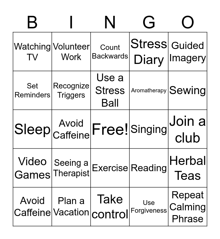 This bingo card has a free space and 24 words: Seeing a Therapist, Plan a Vacation, Use a Stress Ball, Avoid Caffeine, Guided Imagery, Watching TV, Set Reminders, Volunteer Work, Singing, Exercise, Aromatherapy, Sleep, Reading, Herbal Teas, Recognize Triggers, Use Forgiveness, Join a club, Count Backwards, Sewing, Avoid Caffeine, Repeat Calming Phrase, Video Games, Stress Diary and Take control.