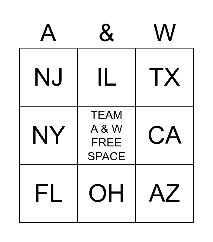 This bingo card has a free space and 8 words: CA, TX, IL, FL, NJ, AZ, NY and OH.