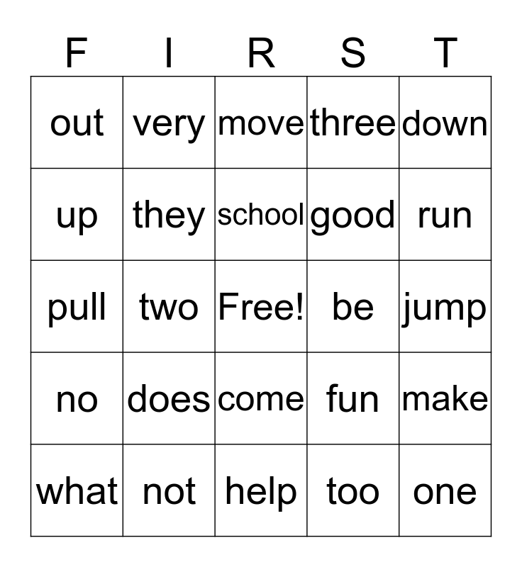 This bingo card has a free space and 24 words: does, not, school, what, down, out, up, very, be, come, good, pull, fun, make, they, too, jump, move, run, two, one, no, three and help.