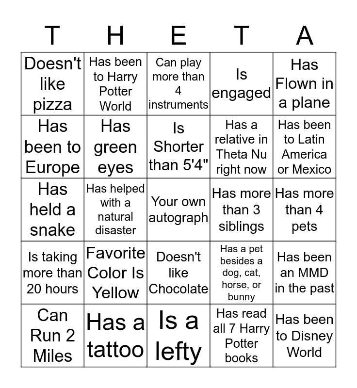 This bingo card has a free space and 24 words: Favorite Color Is Yellow, Has a tattoo, Is Shorter than 5'4", Can Run 2 Miles, Has Flown in a plane, Doesn't like pizza, Has been to Europe, Has been to Harry Potter World, Has more than 3 siblings, Doesn't like Chocolate, Has a relative in Theta Nu right now, Has held a snake, Has a pet besides a dog, cat, horse, or bunny, Has been an MMD in the past, Has green eyes, Has read all 7 Harry Potter books, Has more than 4 pets, Can play more than 4 instruments, Has been to Latin America or Mexico, Has helped with a natural disaster, Has been to Disney World, Is taking more than 20 hours, Is engaged and Is a lefty.