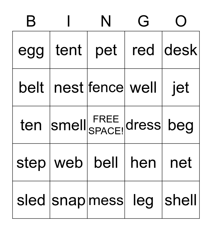 This bingo card has a free space and 24 words: web, snap, fence, sled, desk, egg, belt, tent, dress, bell, well, ten, hen, net, nest, leg, beg, pet, jet, smell, shell, step, red and mess.