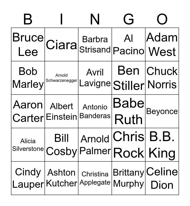 This bingo card has 40 words: Aaliyah, Aaron Carter, Ashle Olsen, Arnold Schwarzenegger, Ashton Kutcher, Arnold Palmer, Avril Lavigne, Adam Sadler, Adam West, Alicia Silverstone, Albert Einstein, Al Pacino, Antonio Banderas, Beyonce, Babe Ruth, Bill Cosby, Billie Holiday, Bruce Lee, Bob Dylan, Barbra Strisand, B.B. King, Brittany Murphy, Ben Stiller, Bob Marley, Brad Pitt, Britney Spears, Cameron Diaz, Colin Farrell, Celine Dion, Cher, Cindy Crawford, Cindy Lauper, Charlie Sheen, Chris Rock, Chuck Norris, Christina Applegate, Cristiano Ronaldo, Chris Evans, Ciara and Colin Firth.