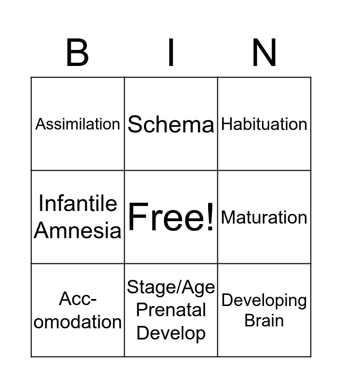 This bingo card has a free space and 8 words: Maturation, Habituation, Schema, Acc-omodation, Assimilation, Developing Brain, Infantile Amnesia and Stage/Age Prenatal Develop.