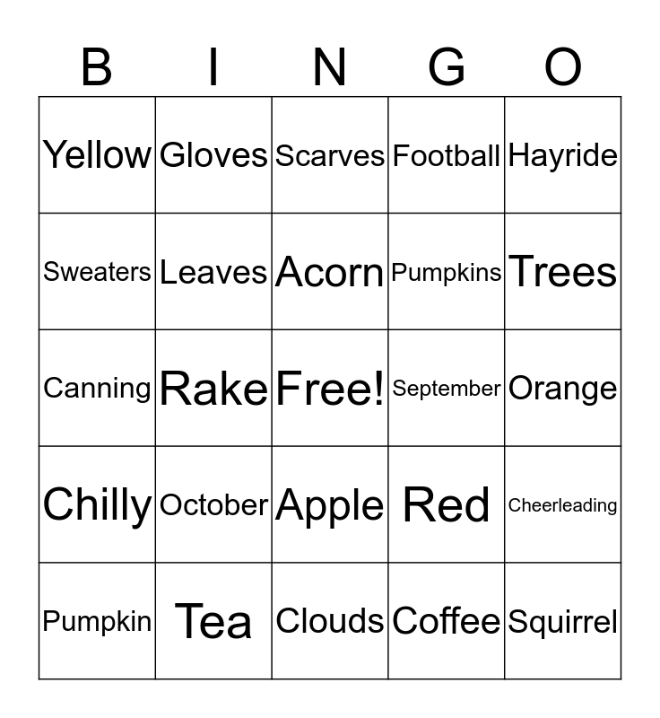This bingo card has a free space and 39 words: Scarecrow, Fall, Autumn, Leaves, Pumpkin, Apple, Acorn, Sunflower, Hayride, Chilly, Rake, Football, Squirrel, Orange, September, October, Cider, Yellow, Brown, Red, Sweaters, Clouds, Pumpkins, Trees, Hay Rides, Thundershowers, Hot Chocolate, Soup, Blankets, Gloves, Hats, Jackets, Scarves, Tea, Coffee, Soccer, Cheerleading, Canning and Harvest.