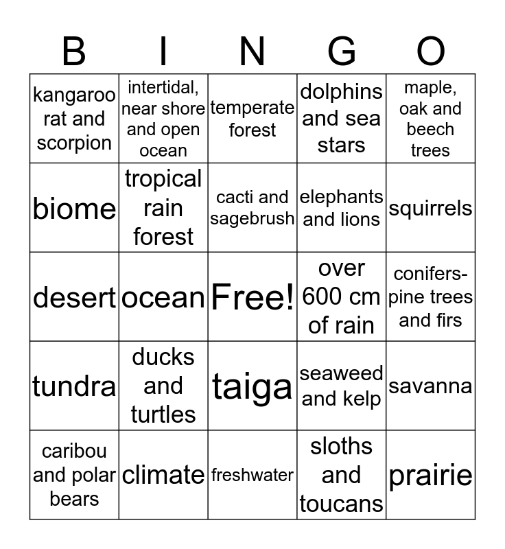 This bingo card has a free space and 24 words: ducks and turtles, climate, cacti and sagebrush, caribou and polar bears, maple, oak and beech trees, kangaroo rat and scorpion, biome, intertidal, near shore and open ocean, over 600 cm of rain, taiga, elephants and lions, desert, seaweed and kelp, savanna, tropical rain forest, sloths and toucans, conifers-pine trees and firs, temperate forest, squirrels, ocean, prairie, tundra, dolphins and sea stars and freshwater.