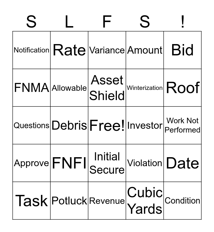 This bingo card has a free space and 24 words: FNFI, Potluck, Asset Shield, Task, Bid, Notification, FNMA, Rate, Investor, Initial Secure, Winterization, Questions, Violation, Date, Allowable, Cubic Yards, Work Not Performed, Variance, Roof, Debris, Condition, Approve, Amount and Revenue.