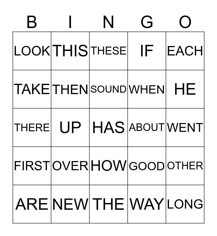 This bingo card has a free space and 24 words: OVER, NEW, SOUND, ARE, EACH, LOOK, TAKE, THIS, ABOUT, HOW, WHEN, THERE, GOOD, OTHER, THEN, WAY, WENT, THESE, HE, UP, LONG, FIRST, IF and THE.