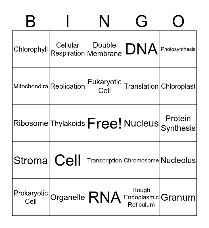 This bingo card has a free space and 24 words: Cell, Organelle, Eukaryotic Cell, Prokaryotic Cell, Photosynthesis, Chlorophyll, Mitochondira, Cellular Respiration, Nucleus, Transcription, Translation, Ribosome, Chromosome, Nucleolus, Replication, Rough Endoplasmic Reticulum, Protein Synthesis, Double Membrane, Chloroplast, Thylakoids, Granum, Stroma, DNA and RNA.