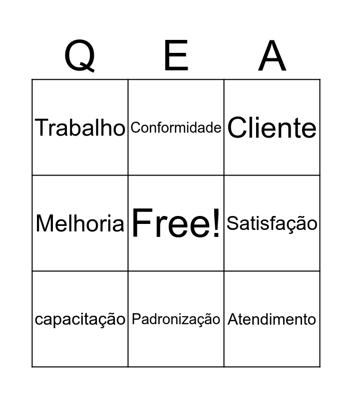 This bingo card has a free space and 12 words: Qualidade, Excelência, Atendimento, Satisfação, Conformidade, Cliente, Padronização, Treinamento, Trabalho, Melhoria, capacitação and certo.