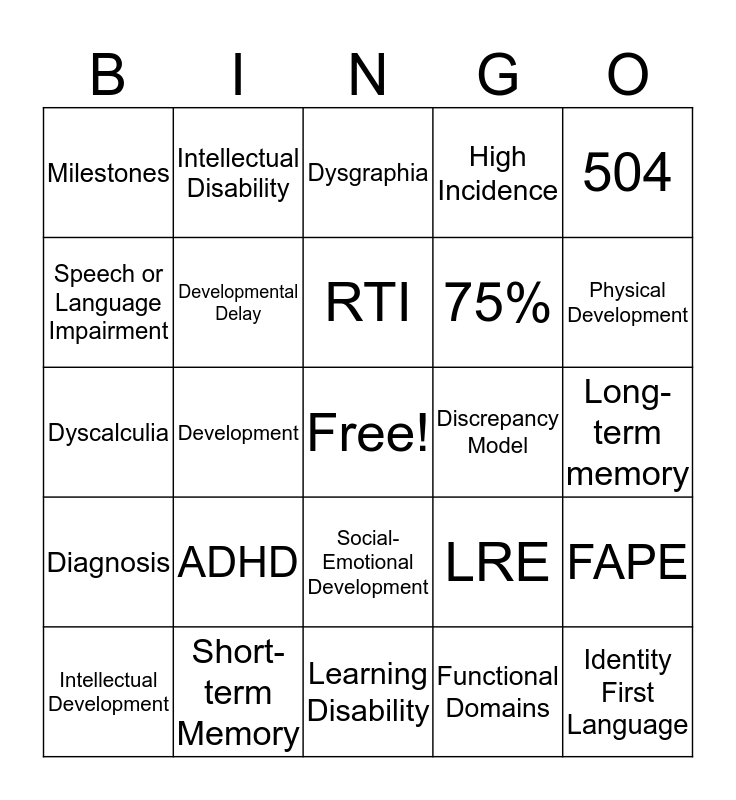 This bingo card has a free space and 47 words: Disability, Identity First Language, Social model, Learning Disability, ADHD, Autism, Intellectual Disability, Emotional Disturbance, Speech or Language Impairment, Other Health Impairment, Developmental Delay, High Incidence, FAPE, LRE, IDEA Part C, Early Intervention, RTI, Discrepancy Model, Parental Consent, 504, Development, Functional Domains, Milestones, 75%, Developmental Delay, Physical Development, Intellectual Development, Language Development, Social-Emotional Development, Diagnosis, Prenatal, Biological, Environmental, Prevention, Sensory Register, Short-term Memory, Long-term memory, Working memory, Attention, Perception, Dyslexia, Dysgraphia, Dyscalculia, Active/strategic learner, Passive/non-strategic learner, Metacognition and Learned helplessness.