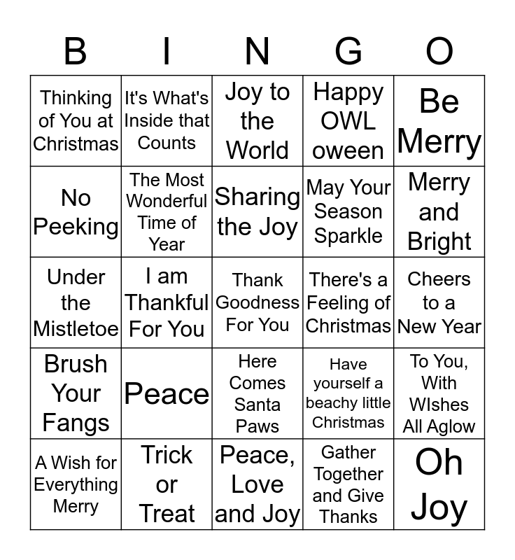 This bingo card has 25 words: Peace, Peace, Love and Joy, Sharing the Joy, A Wish for Everything Merry, Be Merry, Thinking of You at Christmas, No Peeking, It's What's Inside that Counts, There's a Feeling of Christmas, Here Comes Santa Paws, May Your Season Sparkle, Under the Mistletoe, Have yourself a beachy little Christmas, To You, With WIshes All Aglow, The Most Wonderful Time of Year, Oh Joy, Cheers to a New Year, Joy to the World, Merry and Bright, I am Thankful For You, Thank Goodness For You, Trick or Treat, Brush Your Fangs, Happy OWL oween and Gather Together and Give Thanks.