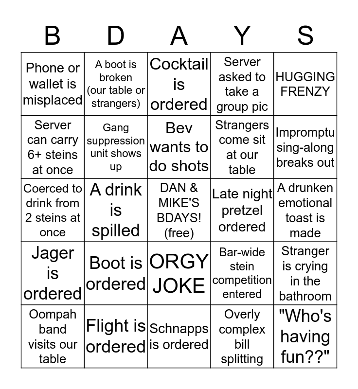 This bingo card has a free space and 24 words: Boot is ordered, Flight is ordered, Bev wants to do shots, Oompah band visits our table, HUGGING FRENZY, Phone or wallet is misplaced, Server can carry 6+ steins at once, A boot is broken (our table or strangers), Late night pretzel ordered, ORGY JOKE, Strangers come sit at our table, Coerced to drink from 2 steins at once, Bar-wide stein competition entered, Stranger is crying in the bathroom, Gang suppression unit shows up, Overly complex bill splitting, A drunken emotional toast is made, Cocktail is ordered, Impromptu sing-along breaks out, A drink is spilled, "Who's having fun??", Jager is ordered, Server asked to take a group pic and Schnapps is ordered.