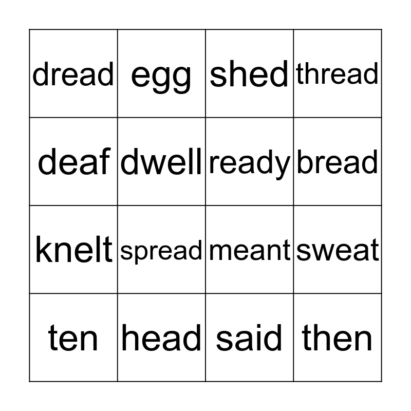 This bingo card has 24 words: again, Ben, bread, chest, deaf, dread, dwell, egg, head, jelly, knelt, meant, mend, quest, ready, red, said, shed, spread, sweat, ten, then, thread and wealth.