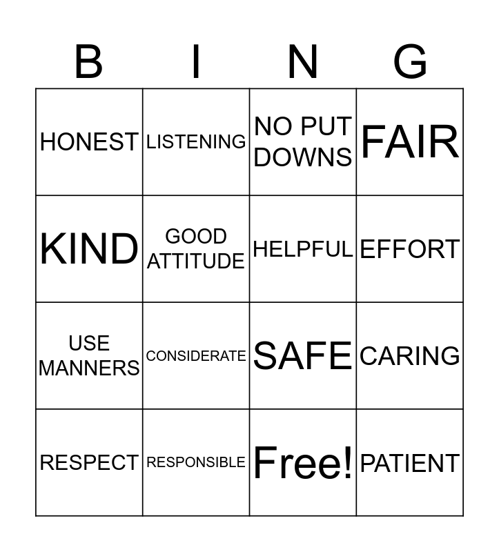 This bingo card has 17 words: Free!, RESPECT, NO PUT DOWNS, HONEST, CONSIDERATE, FAIR, CARING, HELPFUL, EFFORT, GOOD ATTITUDE, RESPONSIBLE, SAFE, KIND, LISTENING, USE MANNERS, THANKFUL and PATIENT.