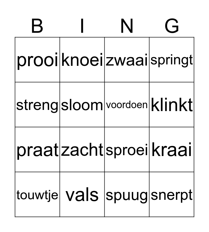This bingo card has 16 words: vals, kraai, zwaai, prooi, praat, knoei, sproei, spuug, streng, sloom, touwtje, springt, zacht, klinkt, voordoen and snerpt.