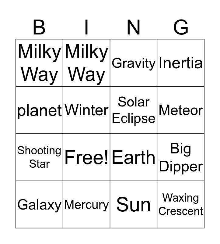 This bingo card has 18 words: Free!, Waxing Crescent, Gravity, Milky Way, Earth, Inertia, Galaxy, Milky Way, Meteor, Shooting Star, Sun, planet, Big Dipper, Winter, Solar Eclipse, Rotation, Mercury and Venus.