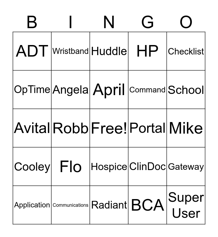 This bingo card has a free space and 24 words: Flo, Communications, April, Application, Checklist, ADT, OpTime, Wristband, Portal, Hospice, Command, Avital, ClinDoc, Gateway, Angela, BCA, Mike, Huddle, School, Robb, Super User, Cooley, HP and Radiant.
