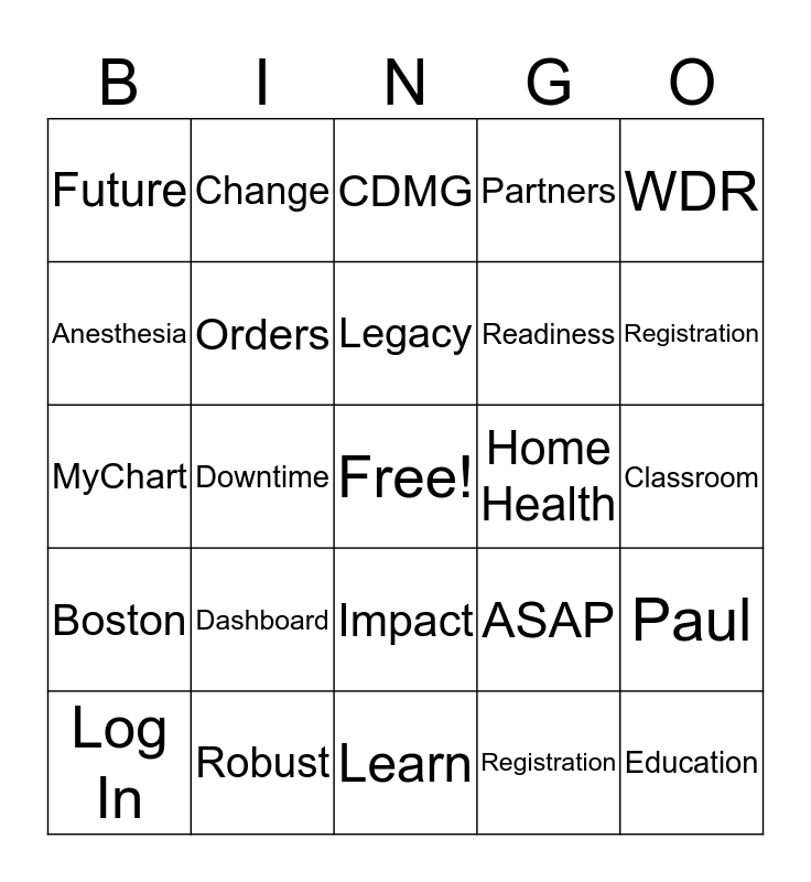 This bingo card has a free space and 24 words: Dashboard, Robust, Legacy, Log In, WDR, Future, Anesthesia, Change, Home Health, Impact, Readiness, MyChart, ASAP, Paul, Orders, Registration, Classroom, CDMG, Registration, Downtime, Education, Boston, Partners and Learn.