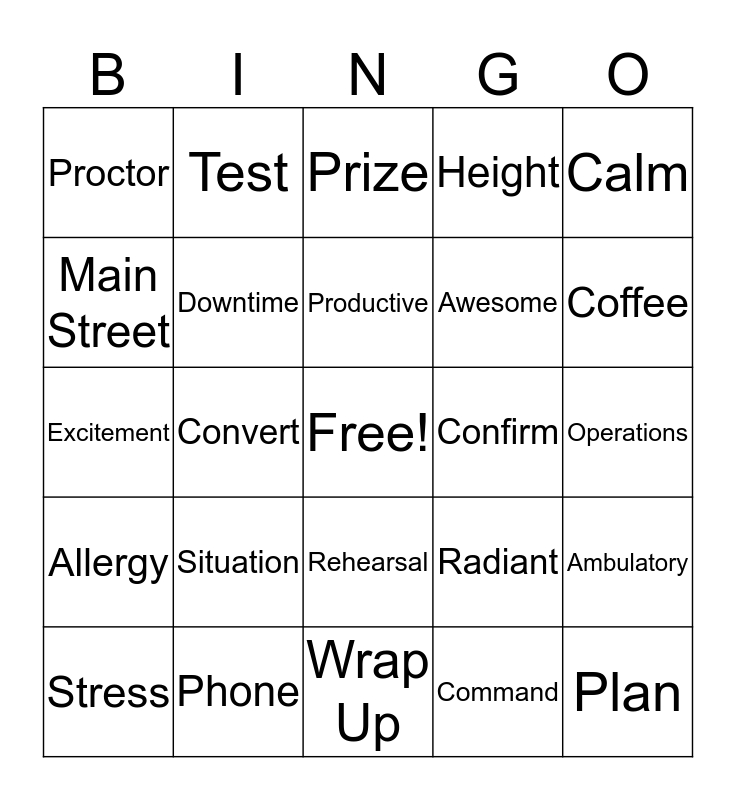 This bingo card has a free space and 24 words: Situation, Phone, Productive, Stress, Calm, Proctor, Main Street, Test, Confirm, Rehearsal, Awesome, Excitement, Radiant, Ambulatory, Downtime, Command, Operations, Prize, Coffee, Convert, Plan, Allergy, Height and Wrap Up.