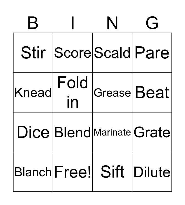 This bingo card has 22 words: Free!, Whip, Score, Mince, Fold in, Grease, Stir, Scald, Marinate, Dilute, Dice, Pare, Combine, Puree, Sift, Cream, Grate, Blanch, Blend, Knead, Beat and Baste Chop.