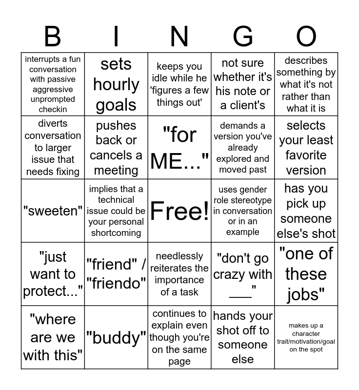 This bingo card has a free space and 24 words: "friend" / "friendo", "buddy", "for ME...", "where are we with this", describes something by what it's not rather than what it is, interrupts a fun conversation with passive aggressive unprompted checkin, diverts conversation to larger issue that needs fixing, sets hourly goals, uses gender role stereotype in conversation or in an example, needlessly reiterates the importance of a task, demands a version you've already explored and moved past, "sweeten", "don't go crazy with ___", "one of these jobs", pushes back or cancels a meeting, hands your shot off to someone else, has you pick up someone else's shot, keeps you idle while he 'figures a few things out', selects your least favorite version, implies that a technical issue could be your personal shortcoming, makes up a character trait/motivation/goal on the spot, "just want to protect...", not sure whether it's his note or a client's and continues to explain even though you're on the same page.