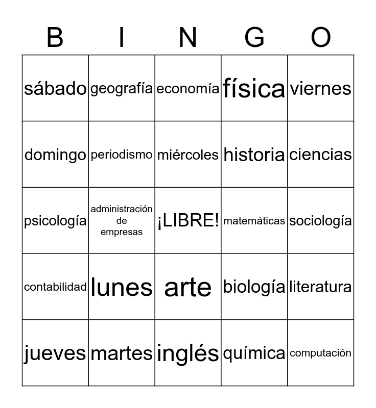 This bingo card has a free space and 24 words: lunes, martes, miércoles, jueves, viernes, sábado, domingo, geografía, matemáticas, arte, historia, psicología, biología, literatura, periodismo, química, sociología, economía, ciencias, administración de empresas, computación, contabilidad, física and inglés.