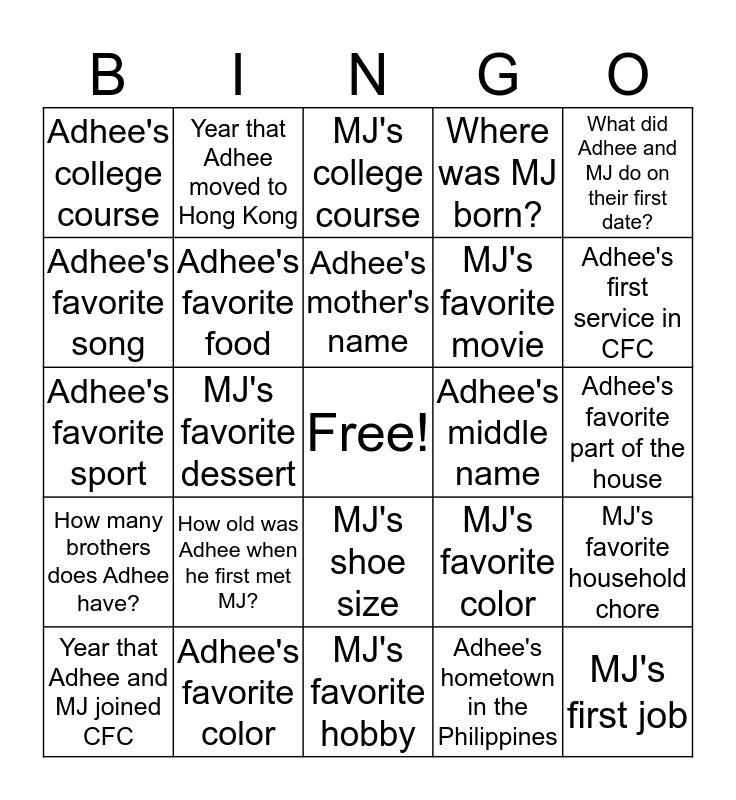 This bingo card has a free space and 30 words: Adhee's favorite color, Adhee's shoe size, MJ's favorite dessert, MJ's number of siblings, Adhee's college course, MJ's college course, Adhee's favorite food, MJ's shoe size, Adhee's middle name, MJ's favorite hobby, Adhee's favorite part of the house, MJ's first job, Adhee's hometown in the Philippines, MJ's favorite drink, Adhee's first service in CFC, MJ's dream destination, MJ's favorite color, How many brothers does Adhee have?, How old was Adhee when he first met MJ?, What did Adhee and MJ do on their first date?, Adhee's favorite sport, MJ's favorite high school subject, Year that Adhee moved to Hong Kong, MJ's favorite movie, Adhee's favorite song, Where was MJ born?, MJ's favorite household chore, Year that Adhee and MJ joined CFC, Adhee's mother's name and Year that Adhee and MJ got married.