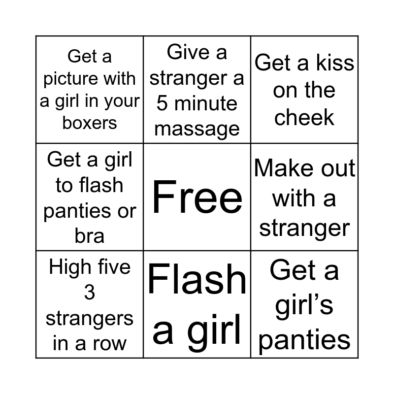 This bingo card has a free space and 8 words: Make out with a stranger, Get a kiss on the cheek, Give a stranger a 5 minute massage, High five 3 strangers in a row, Get a picture with a girl in your boxers, Get a girl’s panties, Get a girl to flash panties or bra and Flash a girl.